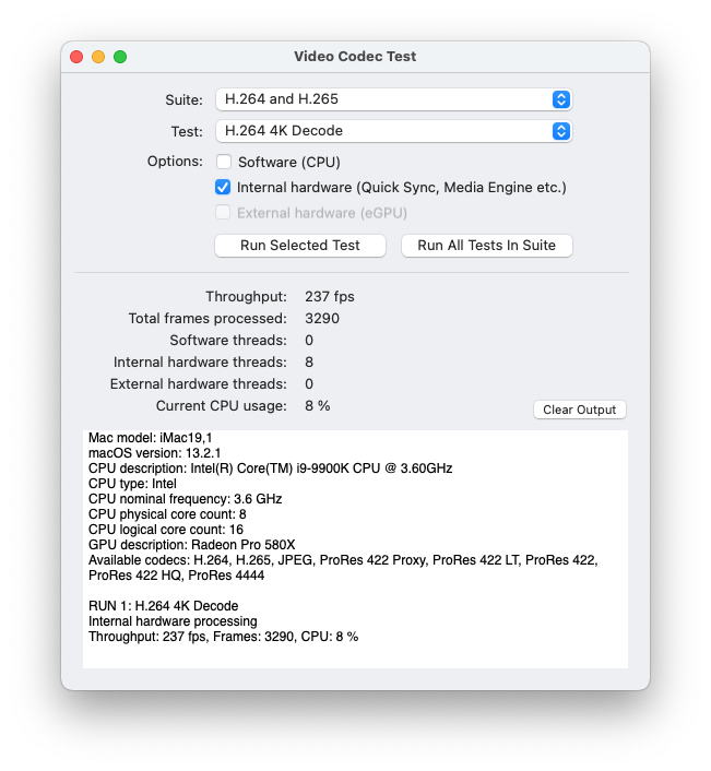This utility measures the video processing capabilities of your Mac, providing benchmarks for H.264, H265, JPEG and ProRes encoding and decoding performance.